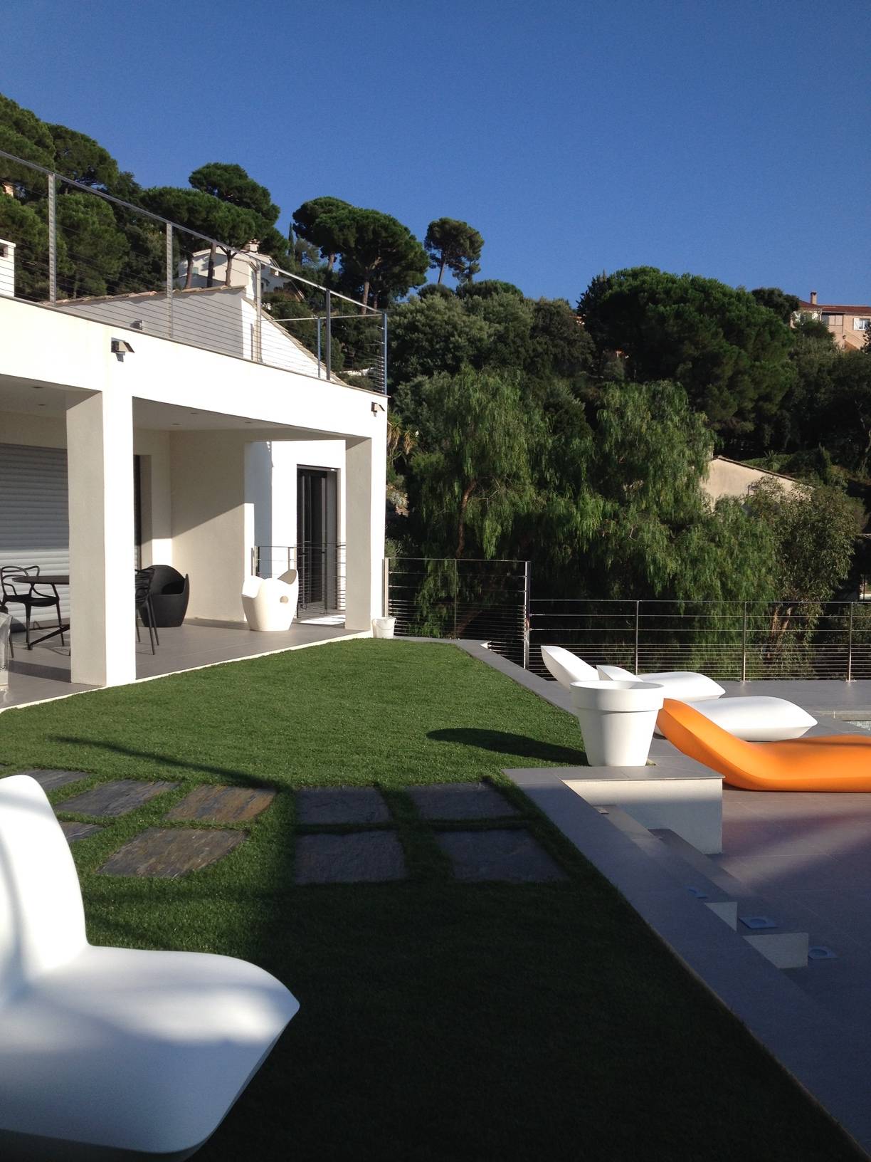 Auffray Paysage s'est occupé d'une pose de gazon synthétique avec plantations de végétaux à Sainte Maxime 83.